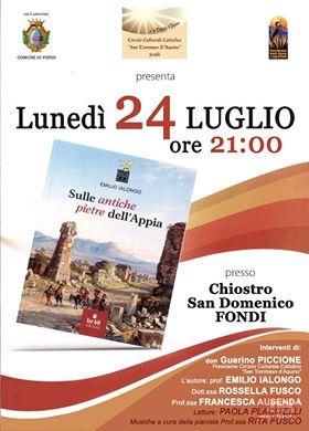 Lunedì 24 luglio p.v. alle ore 21,00, presso la Chiesa di San Tommaso D’Aquino in Fondi, verrà presentato il libro “Sulle antiche pietre dell’Appia” del Prof. Emilio Ialongo. L’iniziativa è promossa dall’Associazione "Circolo Culturale Cattolico San Tommaso D'Aquino" e si avvale del patrocinio del Comune di Fondi Il lavoro, pubblicato dal SISTEMA BIBLIOTECARIO SUD PONTINO ed inserito nella collana “memorie del territorio”, è il risultato di un’attenta e accurata ricerca storico-documentaristica delle impressioni lasciate dai viaggiatori del passato che attraversavano la via Appia proprio nel segmento sud-pontino, da Terracina al Garigliano.
