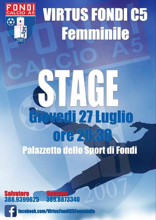 La società sportiva Virtus Fondi calcio a 5 rende noto che giovedì 27 luglio alle ore 20,30 si svolgerà lo stage per le ragazze che vogliono avvicinarsi al mondo del futsal.