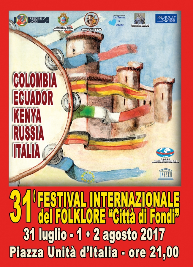 Ritorna una delle manifestazioni più longeve della provincia di Latina: da Lunedì 31 Luglio a Mercoledì 2 Agosto prossimi in piazza Unità d’Italia – anziché, come inizialmente annunciato, in piazza IV Novembre – si svolgerà la XXXI edizione del Festival Internazionale del Folklore “Città di Fondi”.