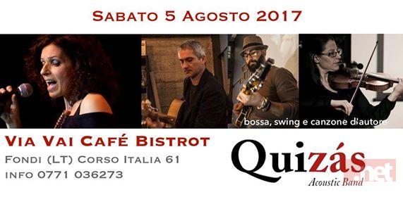 Ancora musica al Via Vai Cafè Bistrot di Fondi con la Quizas Acoustic Band sabato 5 agosto. Il locale di corso Italia in questa estate 2017 sta promuovendo diversi live divenendo un punto di incontro di musicisti, appassionati di musica e amanti della gastronomia. Nelle settimane scorse i concerti di due tribute band dedicate ai Muse e a Vasco Rossi.