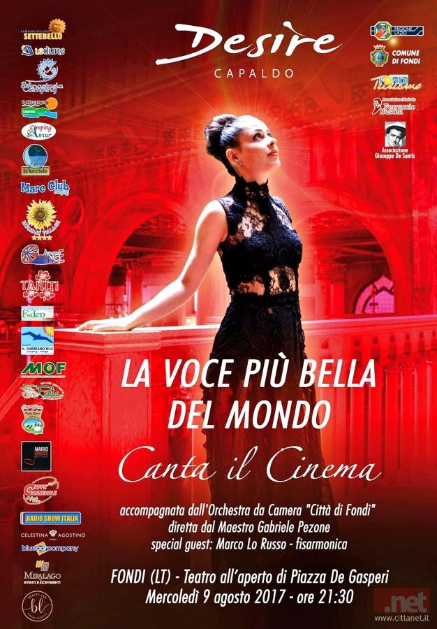 Mercoledì 9 Agosto p.v. alle ore 21.00 nel Teatro all’aperto di Piazza De Gasperi a Fondi è in programma il concerto ad ingresso libero “La voce più bella del mondo canta il Cinema”: l’Orchestra da Camera “Città di Fondi”, diretta dal M° Gabriele Pezone, accompagnerà la cantante di fama internazionale Desire Capaldo in un programma dedicato alla musica per il cinema, con l’esecuzione di brani di alcuni tra i più rinomati compositori di colonne sonore, tra cui Ennio Morricone, Nino Rota, Nicola Piovani, Luis Bacalov.