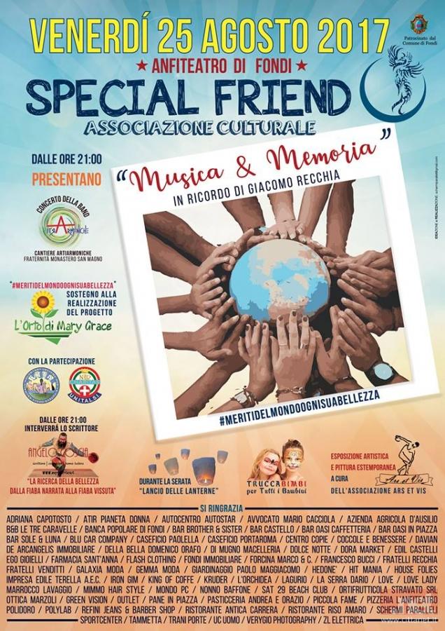 L'evento MUSICA & MEMORIA, arrivato alla terza edizione, è ideato, realizzato e promosso dall'associazione 'Special Friend'. L'associazione nasce da un gruppo di ragazzi per ricordare un amico speciale, Giacomo Recchia, e ha come fine quello di creare iniziative continue nel tempo per la raccolta fondi da destinare ad attività di assistenza sociale per persone disabili o, più in generale, per le persone bisognose. Musica & Memoria rende omaggio a Giacomo, una persona che rideva alla vita. Così il 25 agosto, giorno del suo compleanno, nel nome del grande sorriso con cui ha vissuto e che ha regalato ogni giorno a tutte le persone a lui vicine, l'Associazione Special Friend vuole ricordarlo, provando a donare lo stesso sorriso a persone meno fortunate, attraverso un aiuto mirato, sia economico che morale. Anche quest'anno l'evento si svolgerà nel suggestivo Anfiteatro De Gasperi di Fondi.
