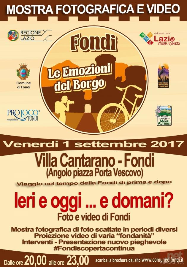 Venerdì 1 Settembre p.v., dalle ore 20.00 alle 23.00 nel giardino di Villa Cantarano (angolo Piazza Porta Vescovo), è in programma l’evento ad ingresso libero “Fondi ieri e oggi… e domani?”, che comprende una mostra fotografica e video con immagini di Fondi nel corso dei decenni.