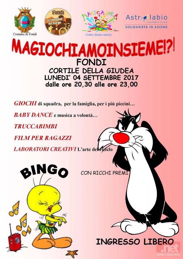 Si rinnova l’appuntamento con “Magiochiamoinsieme!?!”, il laboratorio ludico-didattico del Centro Magicabula rivolto ai bambini dai 6 ai 12 anni per trascorrere piacevolmente una serata in allegria. Dopo il grande consenso riscontrato con la prima iniziativa, Lunedì 4 Settembre dalle ore 20.30 alle 23.00 presso il cortile della Giudea saranno riproposti giochi di squadra, per la famiglia e per i più piccini, baby dance e musica a volontà, truccabimbi, film per ragazzi, laboratori creativi “L’arte del riciclo” e un bingo con ricchi premi.