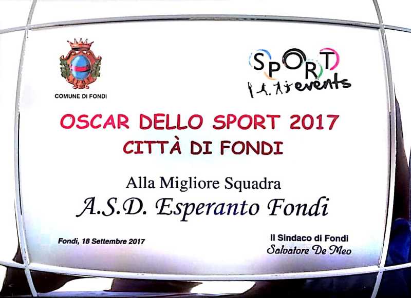 L'ASD Esperanto vittoriosa all'oscar dello sport 2017 città di fondi nella categoria “migliore squadra”