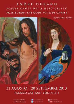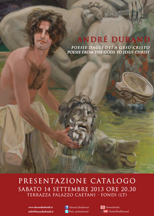 Sarà presentato ufficialmente il 14 Settembre alle 20.30 sulla terrazza del Castello Caetani che domina l’intera piana di Fondi, alla presenza delle più alte cariche istituzionali e culturali, il catalogo in edizione limitata relativo alla mostra di pittura di André Durand, “Poesie dagli dei a Gesù Cristo”. L’evento si inserisce all’interno dell’esposizione delle opere dell’artista a Palazzo Caetani dal 31 Agosto al 20 Settembre 2013. Per l’occasione saranno straordinariamente esposti anche il ritratto ufficiale di Papa Giovanni Paolo II e il “tondo” della contessa Giulia Gonzaga. Continua anche la collaborazione con il Rotaract ed il Rotary Terracina-Fondi in quanto i proventi della vendita dello stesso catalogo contribuiranno al restauro di una cappella della cattedrale di San Cesareo in Terracina.