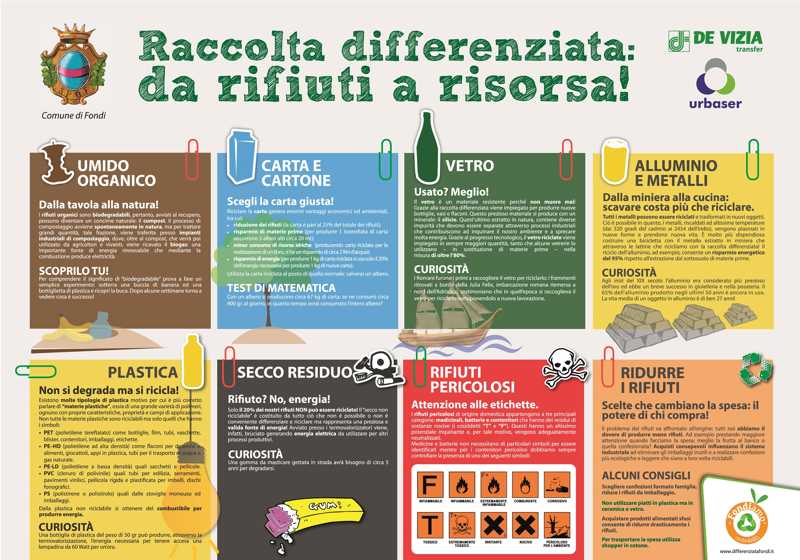 Con tale consapevolezza è stato elaborato ed è in distribuzione da oggi nelle Scuole Elementari, Medie e Superiori il poster informativo “Da rifiuti a risorsa!” per suggerire ad alunni e studenti degli Istituti cittadini nozioni e consigli utili alla creazione di una coscienza ecologica che porti a considerare il rifiuto come risorsa da valorizzare, attraverso operazioni di riciclaggio e recupero, per ottenerne i necessari benefici. La consegna dei poster è accompagnata da una lettera indirizzata ai Dirigenti scolastici, a firma del Sindaco di Fondi Salvatore De Meo e dell’Assessore all’Ambiente Roberta Muccitelli, con cui si chiede di favorire l’affissione del poster in ciascuna aula dei rispettivi Istituti