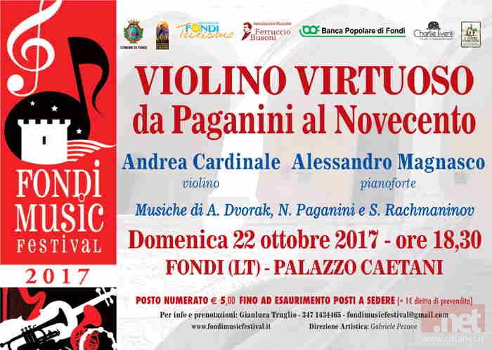 Saranno il violino e il pianoforte i grandi protagonisti del prossimo appuntamento con il “Fondi Music Festival” in programma domenica 22 ottobre presso l’incantevole cornice di Palazzo Caetani a partire dalle 18:30. I brani di Dvorak, Paganini e Rachmaninov riecheggeranno nel sontuoso palazzo quattrocentescco grazie al duo composto da Andrea Cardinale (violino) e Alessandro Magnasco (pianoforte). Si tratta di un’unione particolarmente apprezzata dagli amanti della musica classica da oltre 15 anni come dimostra il successo riscosso in oltre novecento concerti tenuti in tutto il mondo da questa straordinaria coppia artistica. “Violino virtuoso – da Paganini al Novecento”, come è stato denominato il concerto, è stato infatti già applaudito in moltissimi teatri e location storiche del pianeta. Gli artisti hanno inoltre avuto modo di esibirsi nel corso degli anni in un ampio repertorio di musiche composte dal Settecento al Novecento in Urugay come in Giappone, in Francia come in Portogallo, ma anche in Russia, negli Stati Uniti, in Macedonia, in Repubblica Ceca, in Austria e in moltissime altre nazioni dove la classicità è particolarmente apprezzata. Il tutto sempre con grande attenzione filologica e conseguente riscontro di critica e di pubblico con il duo che si è distinto soprattutto per affiatamento e ricercatezze dinamico-interpretative. Si tratta del resto, in entrambi i casi, di due volti piuttosto noti in tv in quanto entrambi sono soliti partecipare a registrazioni televisive dedicate alla musica classica sulle reti nazionali. Per chiudere con una curiosità, Andrea Cardinale non suona un violino qualunque ma un “Vuillaume”del 1864 (collez. Devoto).