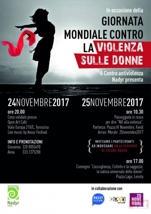 Venerdì 24 novembre alle ore 20.30, presso l’Open Art Cafè, a Terracina, si svolgerà una cena solidale che ha come obiettivo quello di raccogliere fondi per continuare a sostenere le donne attraverso il Centro Antiviolenza Nadyr, attivo con sportelli a Fondi e a Terracina. “La raccolta fondi – scrivono dall’Associazione – si vede necessaria per dar forza ad un lavoro quotidiano basato su volontariato e autofinanziamento, un lavoro quindi che si giova del prezioso contributo di chi ha a cuore le donne e i loro bambini, il loro benessere e la loro libertà, e quindi di quelle cittadine e di quei cittadini che fin dall’inizio ci danno sostegno e forza”.