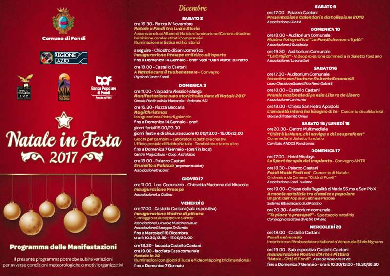 Il Comune di Fondi ha diffuso il calendario delle iniziative natalizie – anche scaricabile digitalmente dal sito www.comunedifondi.it – che animeranno la festa più sentita dell’anno fino al prossimo 14 Gennaio. Sono in programma luminarie e video mapping tridimensionali, concerti, esibizione di corali, iniziative per bambini, proiezione di film a tema natalizio, mostre d’arte e fotografiche, spettacoli teatrali e musicali, premiazioni e molto altro.