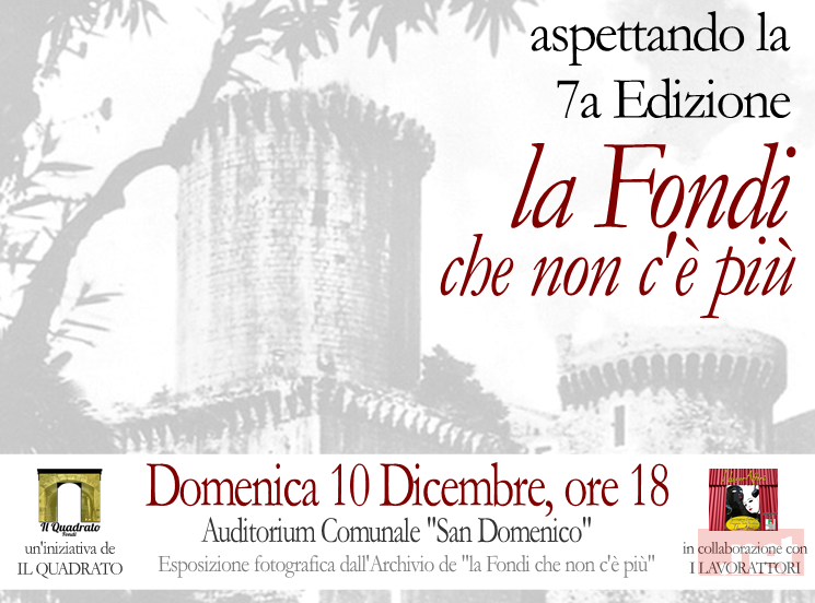 I numerosi impegni in progetti ed eventi proposti durante l'anno e l'impossibilità di disporre delle strutture nei periodi prescelti, in particolare per la festività patronale di Sant'Onorato, vedono l’Associazione “Il Quadrato” costretta a rimandare al 2018 il sempre molto atteso appuntamento con la Mostra "la Fondi che non c'è più".