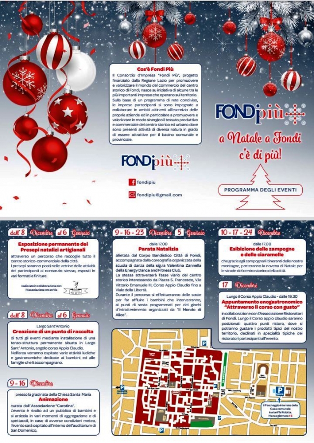Il Consorzio d’Impresa “Fondi Più”, progetto finanziato dalla Regione Lazio per promuovere e valorizzare il mondo del commercio del centro storico di Fondi, ha organizzato un intenso calendario di iniziative per le festività natalizie. Esposizioni, spettacoli, giochi, manifestazioni enogastronomiche che renderanno unico il centro città già a partire dal ponte dell’Immacolata. Momenti di condivisione e di svago per grandi e piccini, che accompagneranno cittadini e turisti fino al 6 gennaio.