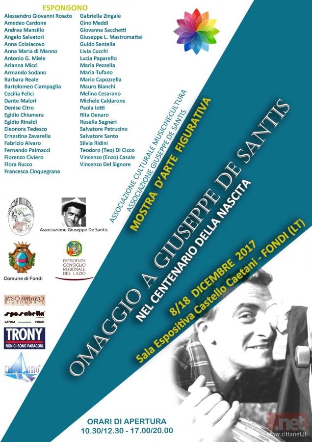 Parallelamente all’esposizione di quadri e sculture saranno proiettate a ciclo continuo sequenze tratte da tutte le pellicole di De Santis e si ascolteranno in sottofondo brani tratti dalle colonne sonore dei suoi film. Tra gli artisti che esporranno le proprie opere anche i terracinesi Fernando Palmacci, Egidio Chiumera e Giovanna Scchetti.