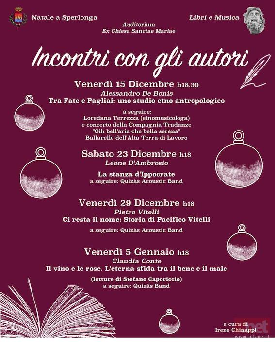 Prende il via Venerdì 15 dicembre alle 18.30 nell’Auditorium Sanctae Mariae l’iniziativa culturale che valorizza gli autori del territorio, all’interno del cartellone di eventi “Natale a Sperlonga”.