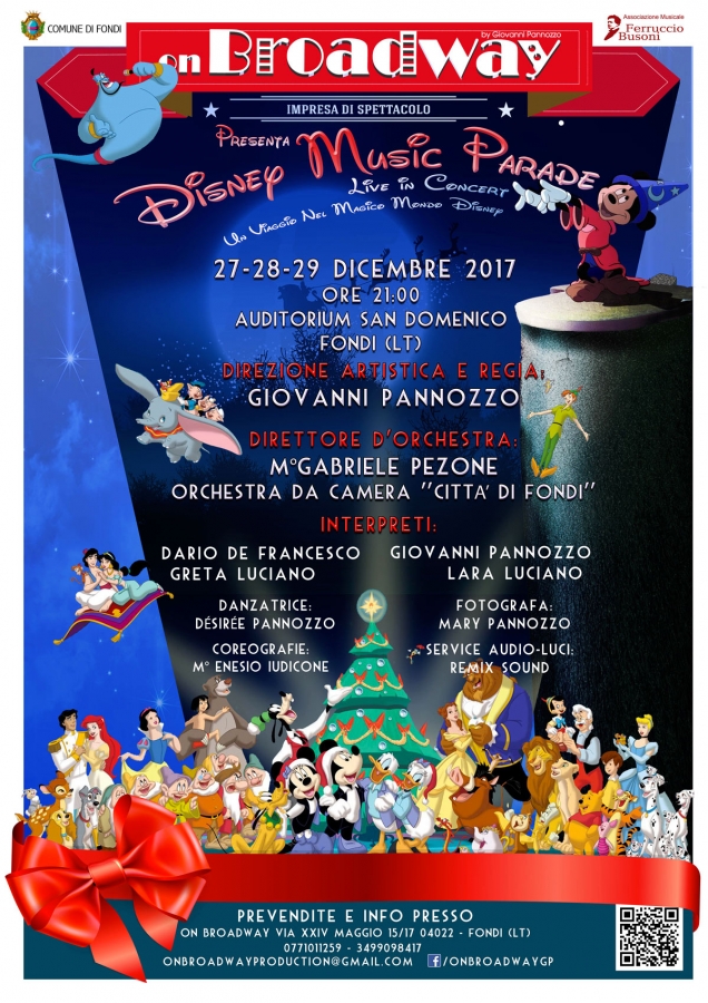 Si accendono i motori per “Disney Music Parade – Live in Concert”, in programma dal 27 al 29 dicembre 2017, alle ore 21:00, presso l’auditorium comunale San Domenico di Fondi (LT)