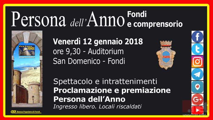 Un fiume di indicazioni già pervenute ai canali dell'Associazione Pro Loco Fondi: Oltre mille ricevute e quattro i nomi più votati per la quinta edizione del premio "Persona dell'Anno" 2017 riservato alle persone che si sono distinte, in qualsiasi campo e ambito, nel dare lustro alla città di Fondi o del comprensorio. Ma c'è ancora tempo per continuare ad indicare la persona che più merita il premio attraverso il web entro domenica 7 gennaio 2018.