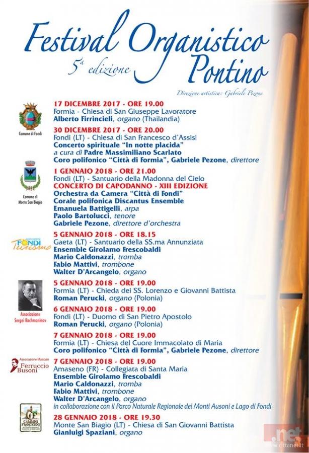 A Gaeta, a partire dalle 18:15 presso il Santuario della Santissima Annunziata, si esibirà l’Ensemble Girolamo Frescobaldi composta da Mario Caldonazzi alla tromba, Fabio Mattivi al trombone e Walter D’Arcangelo all’organo. Alle ore 19 a Formia, presso la chiesa dei Santi Lorenzo e Giovanni Battista, si terrà invece il concerto dell’organista polacco Roman Perucki. Quest’ultimo si esibirà anche domani a Fondi presso il Duomo di San Pietro Apostolo a partire dalle 19:00.