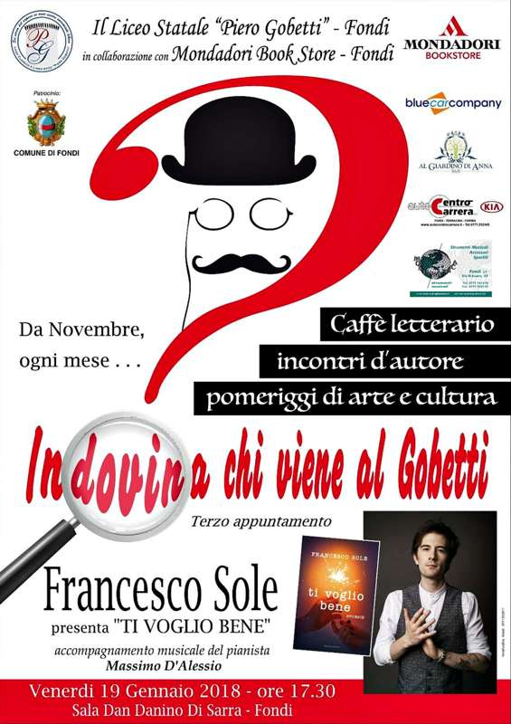 Venerdì 19 Gennaio p.v., alle ore 17.30 presso il Centro Multimediale Dan Danino di Sarra, avrà luogo il terzo appuntamento del Caffè Letterario “Indovina chi viene al Gobetti?” organizzato dal Liceo Statale “Piero Gobetti” sulla scia del successo riportato lo scorso anno con l’incontro con Roberto Vecchioni. Protagonista dell’evento è Francesco Sole che presenta, accompagnato dal pianista Massimo D’Alessio, la raccolta “Ti voglio bene #poesie” (Mondadori, 2017). L’ingresso è libero fino ad esaurimento posti.