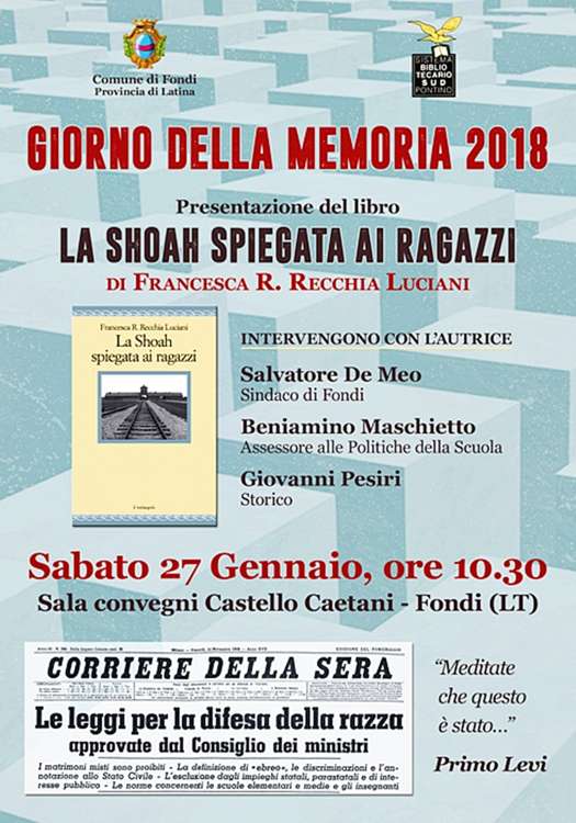 Sabato 27 Gennaio p.v. alle ore 10.30 presso la Sala convegni del Castello Caetani avrà luogo la presentazione del libro “La Shoah spiegata ai ragazzi” (Ed. Il nuovo melangolo, 2016) di Francesca Romana Recchia Luciani, docente di Storia delle Filosofie contemporanee presso l’Università degli Studi di Bari “Aldo Moro”.