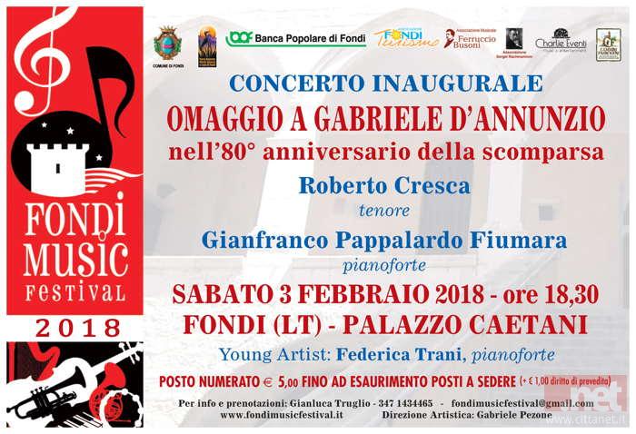 Si terrà a Fondi, in anteprima mondiale, il concerto “Omaggio a Gabriele D’Annunzio” che vedrà esibirsi il duo composto dal grande tenore Roberto Cresca e dal pianista Gianfranco Pappalardo Fiumara. Un debutto in grande stile, quindi, per il Fondi Music Festival la cui VII edizione prenderà ufficialmente il via sabato 3 febbraio alle ore 18:30 presso la splendida cornice di Palazzo Caetani a Fondi. Il primo appuntamento del cartellone presentato nei giorni scorsi è pensato per celebrare l’80° anniversario della scomparsa del poeta, drammaturgo e autore simbolo del decadentismo italiano. Si tratta di un momento particolarmente atteso, dagli artisti e dal pubblico, in quanto il programma sarà interpretato per la prima volta a Fondi per poi essere replicato in moltissimi paesi del mondo, dagli Stati Uniti al Giappone.