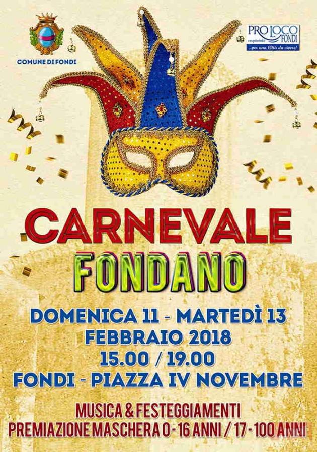Tutti protagonisti al carnevale fondano dalle ore 15.00 alle 19.00 di domenica 11 e martedì 13 febbraio 2018. Sul palco montato in piazza IV Novembre e lungo l'area pedonale del centro storico di Fondi si susseguiranno: