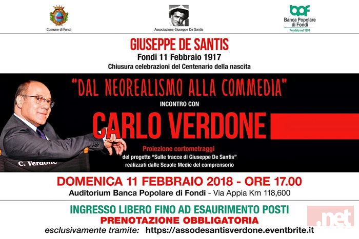 Domenica 11 Febbraio p.v. si concluderanno le celebrazioni del Centenario della nascita del regista Giuseppe De Santis, patrocinate dal Comune di Fondi. Alle ore 17.00 nell’Auditorium della Direzione Generale della Banca Popolare di Fondi si svolgerà l’incontro con Carlo Verdone dal titolo “Dal Neorealismo alla Commedia”.