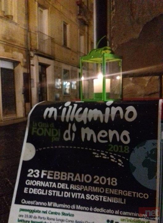 La pioggia non ha fermato "M'illumino di meno". Decine di persone hanno passeggiato nel Centro Storico della nostra Città raccogliendo l'invito di "Fare Verde", che per iniziativa dei Gruppi di Fondi e Monte San Biagio ha organizzato una sorta di percorso culturale e di approfondimento per sensibilizzare l’opinione pubblica relativamente all’importante tema del risparmio energetico, al centro dell’idea lanciata da “Radio2”.