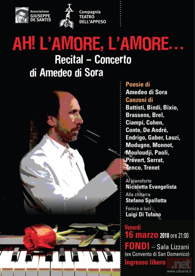Venerdì 16 Marzo 2018, alle ore 21.00, presso la Sala Carlo Lizzani (ex Convento di S. Domenico) a Fondi andrà in scena il recital - concerto “Ah! L’amore, l’amore…” diretto e interpretato da Amedeo di Sora, accompagnato dai maestri Nicoletta Evangelista al pianoforte e Stefano Spallotta alla chitarra. Fonica e luci sono a cura di Luigi Di Tofano.