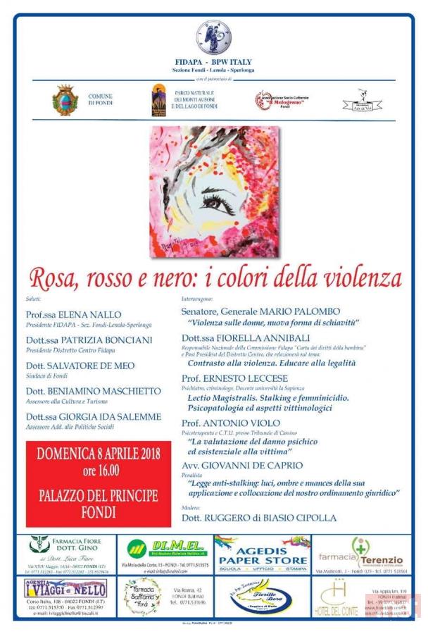 L'8 aprile, alle ore 16:00 presso la “Sala Gaetani” del Palazzo del Principe, l'associazione FIDAPA, col patrocinio dell'associazione “ Il Melograno”, “ Ars et Vis”, il Comune di Fondi e il Parco Naturale “ Monti Ausoni e Lago di Fondi”, terrà il convegno dal titolo “ Rosa, Rosso e Nero: I Colori della Violenza”.