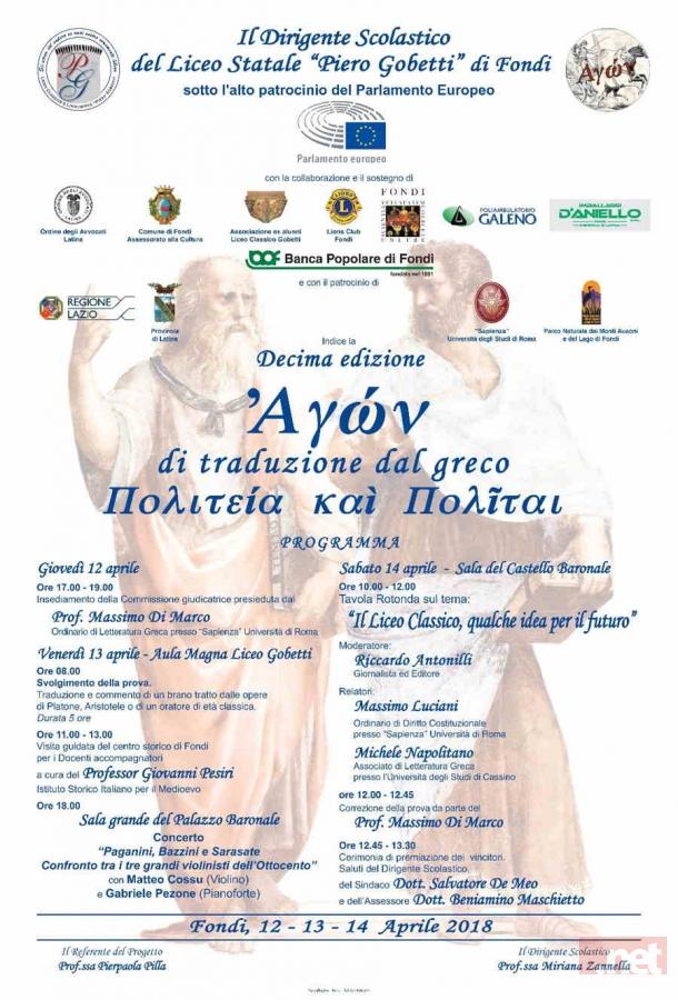 Dal 12 al 14 Aprile si svolgerà la decima edizione del Progetto dal titolo Agώn Gobetti, che vede la presenza a Fondi di studenti e docenti provenienti dai licei classici di diverse regioni d’Italia. I concorrenti si cimenteranno nella traduzione, dal greco in italiano, e nel commento, di un brano tratto dalle opere di Platone, Aristotele o degli oratori di età classica. La prova di traduzione si terrà nell’Aula Magna del Liceo Piero Gobetti, Venerdì 13 aprile. La commissione giudicatrice, presieduta fin dalla prima edizione dal Prof. Massimo Di Marco Ordinario di Lingua e Letteratura Greca presso Sapienza Università di Roma, é composta dai professori Luigi Maria Segoloni, Eleonora Tagliaferro sempre della Sapienza, Maria Luigia Marino, già Dirigente del Liceo Gobetti, Lucio Biasillo, già docente di Storia e Filosofia del Liceo e dal Dottor Fabrizio Petorella, dottorando dell’Università degli Studi Roma Tre ed ex alunno del Gobetti.