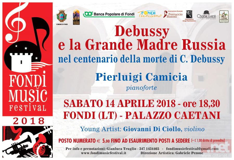 Celebra il simbolismo musicale, il grande compositore francese Claude Debussy ma anche i capolavori della classicità russa il prossimo concerto organizzato nell'ambito del Fondi Music Festival. A esibirsi sabato 14 aprile alle 18:30, nella meravigliosa cornice di Palazzo Caetani, sarà il pianista Pierluigi Camicia, concertista di fama internazionale e per molti anni direttore del Conservatorio Statale di Musica di Lecce. L'evento, intitolato "Debussy e la Grande Madre Russia", è pensato per celebrare il centenario dalla morte del famoso artista francese ma contempla anche interessanti interpretazioni di alcuni tra i più famosi compositori russi. Un programma, insomma, che non mancherà di stupire il pubblico.