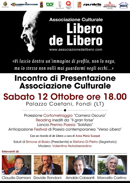 Nasce nella sua città d’origine, a 110 anni dalla sua nascita anagrafica, la prima associazione ufficiale in Italia intitolata a Libero de Libero, una delle figure umane ed intellettuali più complesse ed interessanti del Novecento. Questa nuova realtà si presenterà al pubblico per la prima volta sabato 12 ottobre prossimo a Palazzo Caetani alle ore 18, all’interno di una serata in cui s’incastonano diversi appuntamenti da non perdere.