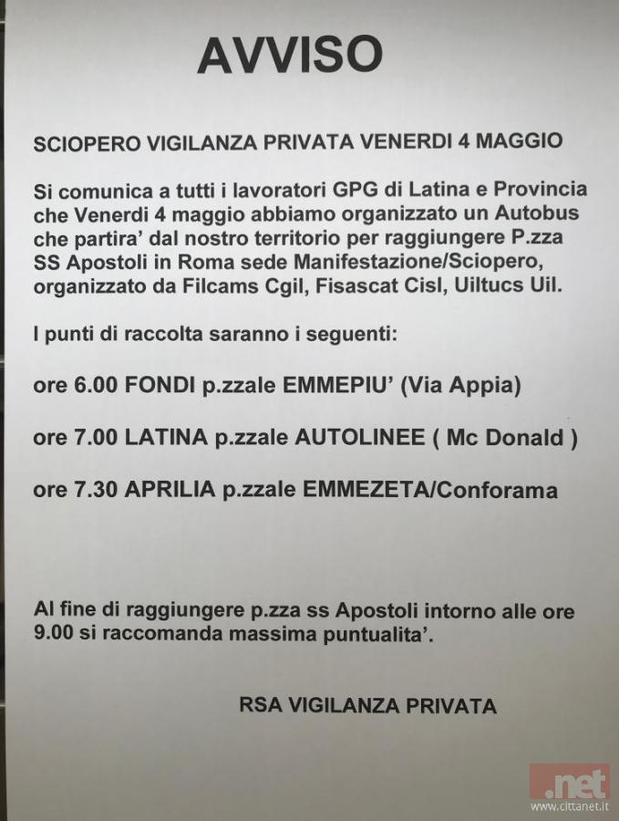 Partirà anche da Fondi un dei pullman per la prossima manifestazione organizzata dalla Uiltucs Uil che si terrà nella Capitale. Il prossimo venerdì 4 maggio, infatti, l'intero comparto della sicurezza si fermerà per dire basta alle numerose, troppe criticità del settore. In primis gli scioperanti si batteranno per il rinnovo del contratto nazionale del lavoro scaduto ormai nel 2015. Alle base nella grande manifestazione che si terrà a Roma, le “indecenti proposte” delle associazioni datoriali. Niente vigilanza, dunque, la notte a cavallo tra il 3 e il 4 maggio. Tutte le guardie giurate resteranno a braccia conserte per poi andare a manifestare a Roma.