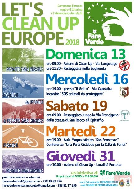 Siamo pertanto a presentare ufficialmente l’Evento LET’S CLEAN UP EUROPE 2018, che i Gruppi Locali di “Fare Verde” delle Città di Fondi e Monte San Biagio terranno nel mese di Maggio, in diversi appuntamenti che presentiamo nello specifico di seguito.