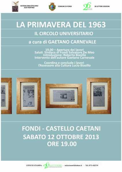 L’Assessorato alla Cultura del Comune di Fondi organizza per Sabato 12 Ottobre alle ore 19.00 presso la Sala Conferenze del Castello Caetani la presentazione del libro “La primavera del 1963 - Il circolo universitario” di Gaetano Carnevale, alla presenza dell’autore.