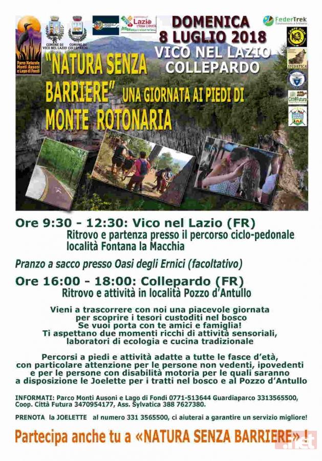 L'Ente Parco Naturale Regionale Monti Ausoni e Lago di Fondi, aderendo all'iniziativa promossa da FederTrek, ha organizzato per domenica 8 luglio 2018 a Vico nel Lazio e Collepardo l'evento “Natura senza barriere” – Una giornata ai piedi di monte Rotonaria. Continuando l'azione di presenza del Parco nei tanti luoghi del vasto territorio che gestisce delle tre aree protette.
