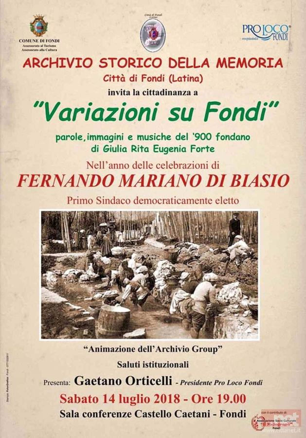 Sabato 14 Luglio p.v., alle ore 18.30 presso la Sala conferenze del Castello Caetani, l’Archivio Storico della Memoria del ‘900 della Città di Fondi proporrà l’evento “Variazioni su Fondi”, programmato nell’ambito del centenario della nascita di Fernando Mariano Di Biasio, primo Sindaco di Fondi, eletto democraticamente nel 1946.