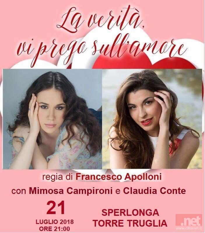 Performance a tre voci sabato 21 luglio a Sperlonga. "La verità, vi prego, sull'amore", con l'interpretazione recitata, cantata e suonata di Claudia Conte e Mimosa Campironi, andrà in scena nella suggestiva cornice della Torre Truglia a partire dalle ore 21:00.