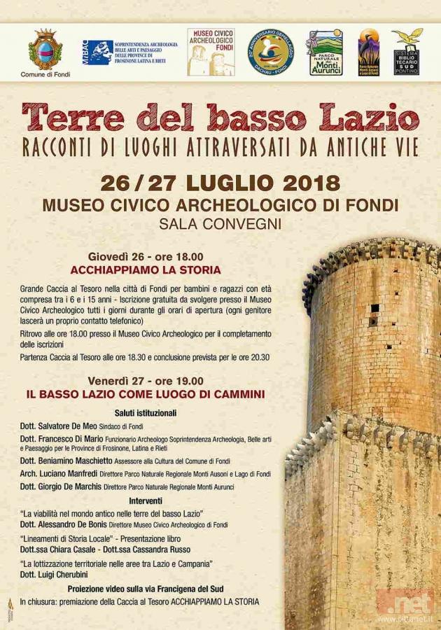 Il Museo Civico Archeologico di Fondi si prepara ad ospitare nei prossimi giorni l’iniziativa “Terre del basso Lazio. Racconti di luoghi attraversati da antiche vie”, articolata nelle giornate di Giovedì 26 e Venerdì 27 Luglio presso la Sala convegni del Castello Caetani.