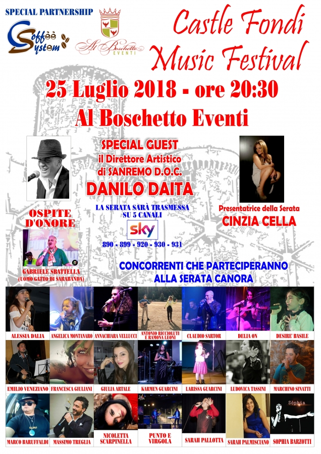 Si terrà il prossimo 25 luglio la seconda edizione del “Castle Fondi Music Festival”, ideato e condotto da Cinzia Cella e ospitato nella location del ristorante "Al Boschetto Eventi". Un contest televisivo, di respiro nazionale, che dopo il successo della prima edizione viene riproposto con un format consolidato, di sicuro gradimento per il pubblico.