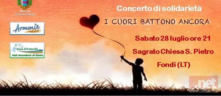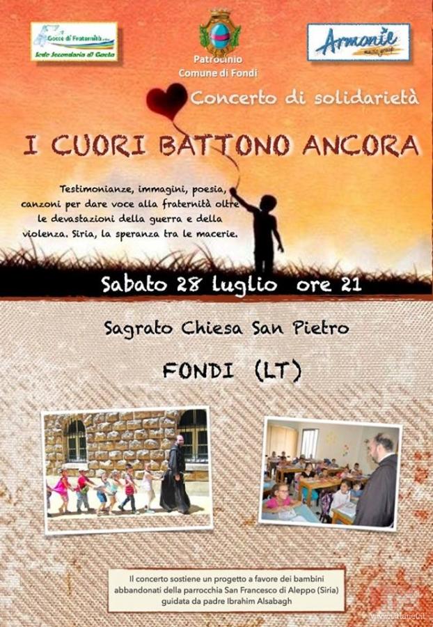 La sede secondaria di Gaeta dell’associazione Gocce di Fraternità Onlus e il gruppo musicale Armonie, con lo scopo di favorire l’attenzione sul dramma umanitario della Siria e promuovere piccoli segni di solidarietà, organizzano una serie di concerti dal titolo “I cuori battono ancora”, i quali, oltre ad offrire spunti di riflessione, con letture e musiche, sul tema della fraternità, della giustizia, della solidarietà e della speranza, hanno lo scopo di raccogliere contributi a favore dei ragazzi abbandonati di Aleppo (Siria).