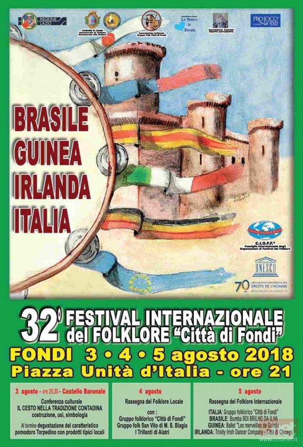 Scrivono gli organizzatori nella brochure della manifestazione: «Il 2018 è stato dichiarato “Anno Europeo del Patrimonio Culturale” e quale migliore occasione se non quella della XXXII edizione del Festival Internazionale del Folklore “Città di Fondi” per celebrarlo nella tre giorni ricca di iniziative ed eventi culturali rivolti alla salvaguardia dei molteplici tesori della cultura tradizionale e popolare dell’Italia e del mondo? In particolare nella regione Lazio e nella Piana di Fondi, con conferenze, incontri, spettacoli, folklore, musica e danza tradizionale: strumenti per favorire la comprensione e l’integrazione tra i popoli».