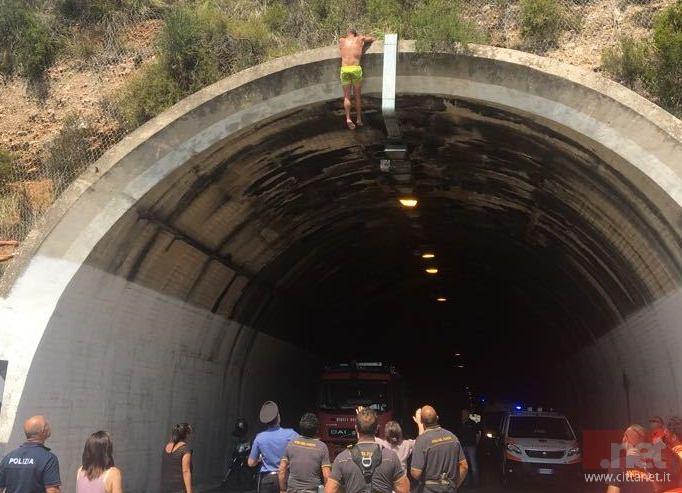 Giunti sul posto gli operatori di Polizia di Stato notavano sull’arcata superiore della galleria a circa 20 metri dal suolo stradale, un uomo in pantaloncini e a torso nudo, che minacciava di saltare nel vuoto se si fossero avvicinati ulteriormente.