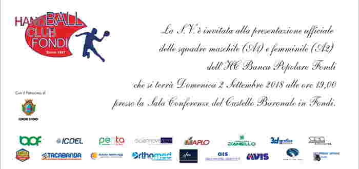 Nel tardo pomeriggio di domenica si terrà poi la presentazione ufficiale delle squadre dell’HC Banca Popolare di Fondi a tifosi, appassionati, giornalisti ed autorità: oltre alla rosa della prima squadra maschile, partecipante al campionato di Serie A1, ci sarà spazio anche per la compagine femminile impegnata nel campionato di Serie A2. L’appuntamento per tutti i sostenitori e gli sportivi fondani è dunque per domenica prossima, 2 settembre, alle ore 19 presso la Sala Conferenza del Castello Baronale di Fondi. Oltre alla presentazione degli atleti ed atlete rossoblù, nel corso della serata verranno esposti dalla dirigenza rossoblù i vari progetti, a partire da ciò che riguarda il settore giovanile con il cosiddetto “Progetto Scuola” fino ad arrivare agli impegni delle squadre di categoria e agli obiettivi delle squadre senior.