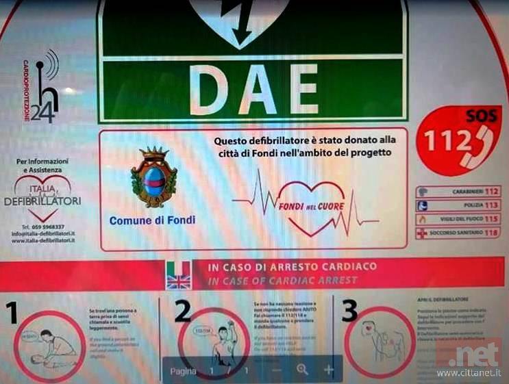 Si terrà domani sera alle ore 18.30 la cerimonia di consegna di un defibrillatore fisso a colonnina, un dono alla comunità fondana da parte dell' Associazione ARS ET VIS e del marchio TORPEDINO nell'ambito del progetto "Fondi nel cuore". La cerimonia avrà luogo nei pressi del Castello (lato ruderi romani). Saranno presenti autorità locali. Tutta la cittadinanza è invitata a partecipare.