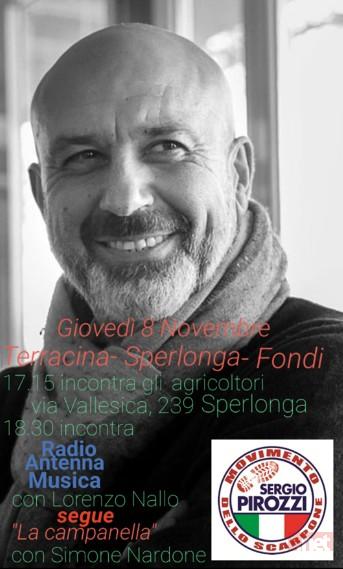 Per incontrare i Cittadini domani sarà tra noi il Consigliere Regionale Sergio Pirozzi, Presidente della XII Commissione (Tutela del territorio, erosione costiera, emergenze e grandi rischi, protezione civile, ricostruzione), accompagnato da Lucia Matita (già Candidata della "Lista Pirozzi) e Lino Conti, in rappresentanza della "Coldiretti" Lazio. L'appuntamento è alle ore 17.15 a Sperlonga, in Via Vallesica 239. Alle ore 18.30 poi Pirozzi si sposterà a Fondi per essere ospite dell'emittente radiofonica "Radio Antenna Musica" 92.2 FM nell'ambito del Programma "La Campanella", condotto da Simone Nardone con la partecipazione di Francesco Carnevale e Lorenzo Nallo.
