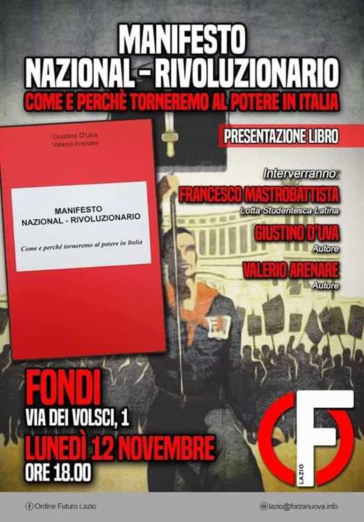 Lunedì 12 novembre dalle ore 18:00 a Fondi, nella sezione di Forza Nuova in via dei Volsci 1, ci sarà la presentazione del libro "Manifesto Nazional-Rivoluzionario" con gli autori Giustino D'Uva e Valerio Arenare, in collaborazione con Francesco Mastrobattista (responsabile di Lotta Studentesca Latina).