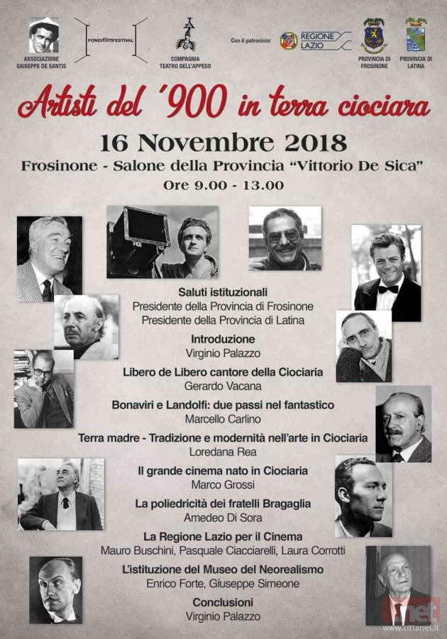 Venerdì 16 Novembre 2018, dalle ore 9.00 alle 13.00 nel salone di rappresentanza della Provincia di Frosinone, è in programma il penultimo appuntamento della XVII edizione del FONDIfilmFESTIVAL: il convegno “Artisti del ‘900 in terra ciociara”.