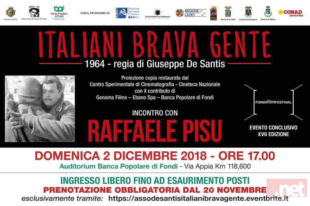 Domenica 2 Dicembre 2018 alle ore 17.00 si terrà nell’Auditorium della Banca Popolare di Fondi (via Appia Km. 118,600) l’evento conclusivo del XVII FONDIfilmFESTIVAL, con la proiezione della versione restaurata di “Italiani brava gente” (1964) di Giuseppe De Santis.