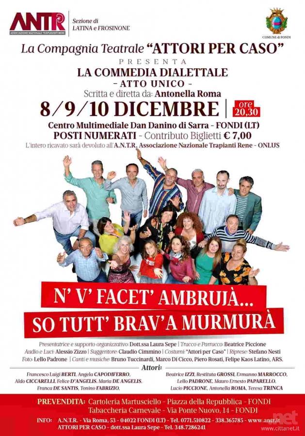 Andrà in scena da Sabato 8 a Lunedì 10 Dicembre prossimi, alle ore 20.30 presso il Centro Multimediale Dan Danino di Sarra, la commedia “N’ v’ facet’ ambrujà… So’ tutt’ brav’ a murmurà”, scritta e diretta da Antonella Roma e rappresentata dalla Compagnia Teatrale “Attori per caso”.